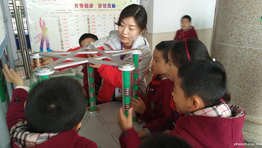 巡展现场,科技辅导员为同学们演示展品操作、讲解原理,同学们兴致勃勃地观察科学现象,不时还用笔记本抄录着说明牌上的科学原理。在展品“锥体上滚”旁,一位同学皱着眉头思考着,一会动手操作展品,一会看看展品的原理介绍,最后终于找到了答案,开心的笑了出来。“这椎体的向上坡滚动,原来是由于重心的变化,我被眼睛欺骗了,太神奇啦!”。同学们在体验中感受学习的乐趣,在讨论中掌握展品的科学知识。